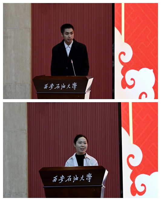 第六届“全国百佳心理委员”国贸2001班姚汤博和经济管理学院优秀指导教师任仰,作为师生代表上台发言。