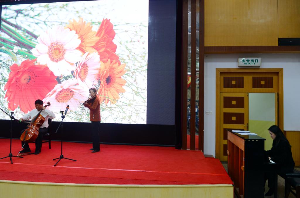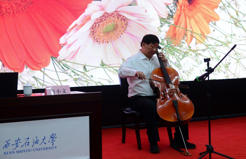 现场,叶小文分享了自己与音乐结缘的过程,讲解了“乐”的教化作用。叶小文作为满天星业余交响乐团团长兼首席大提琴演奏者,与满天星业余交响乐团小提琴演奏者、beat365官网外国语学院教授张梅娟,在音乐系专业教师的钢琴伴奏下,共同演奏了曲目《梁祝》,随后叶小文用大提琴独奏了一曲《牧歌》。钢琴跳跃音符的引入,配合着提琴的细腻流畅,以生动的音乐示范浸润着师生的心灵,引发现场阵阵掌声。