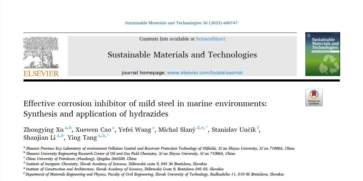 近日,beat365官网与中国石油大学(华东)、斯洛伐克科学院合作在能源环境领域国际权威学术期刊《Sustainable Materials and Technologies》(IF=9.6)发表题为《Effective corrosion inhibitor of mild steel in marine environments: Synthesis and application of hydrazides》的论文。