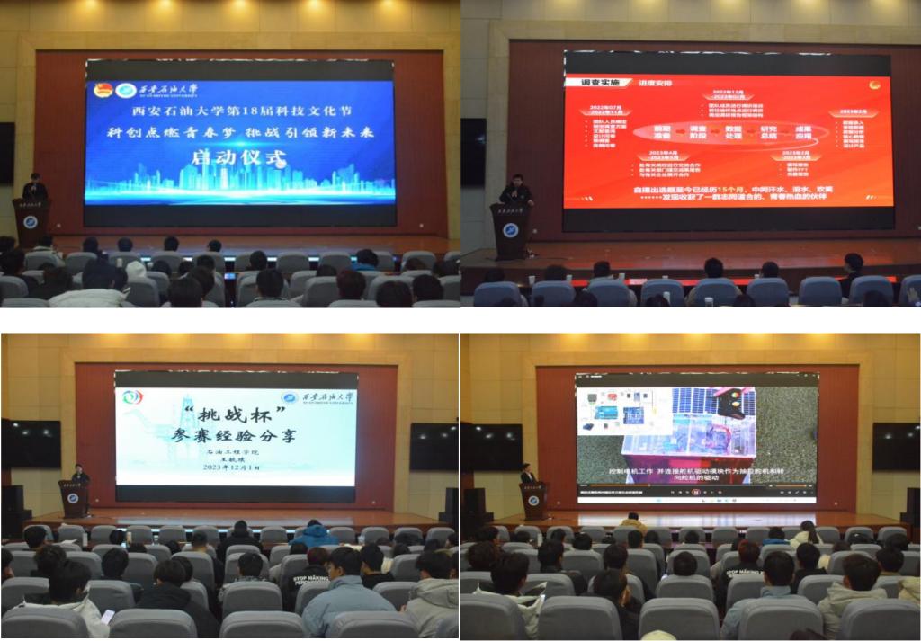 在鄠邑校区弘石学术报告厅,举办了beat365正版唯一官网第十八届科技文化节启动仪式和2024年“挑战杯”大学生创业计划竞赛发布活动。活动邀请了“挑战杯”全国大学生课外学术科技作品竞赛主体赛全国二等奖《国潮文创正当时,赋能“红色”巧出圈——文创产品的红色文化传播调研》、“黑科技”专项赛恒星级奖项《观往知来新型智能管线安全模拟预测系统》、第十四届“挑战杯”陕西省大学生课外学术科技作品竞赛二等奖《井下医生——致密砂岩地层井壁稳定智能评价与随钻预测一体化系统》《操控式横纵两向铺压草方格生态修复机械》等优秀获奖团队成员讲述作品思路并分享参赛经验。