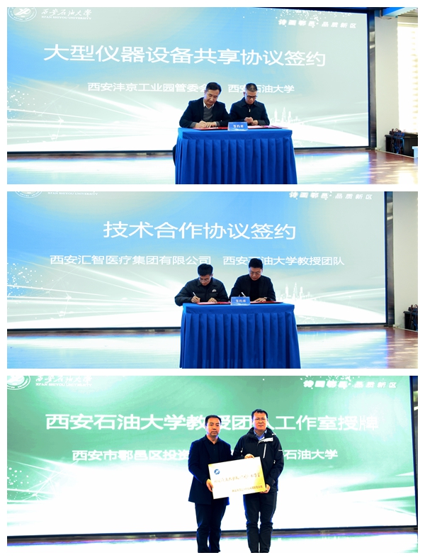 期间,实验室管理处负责人代表学校与沣京工业园签订大型仪器设备开放共享协议;化学化工学院杨博老师团队与西安汇智医疗集团有限公司签订技术合作意向协议;科技处负责人代表学校接受沣京工业园管委会颁发的beat365正版唯一官网教授团队工作室牌匾。