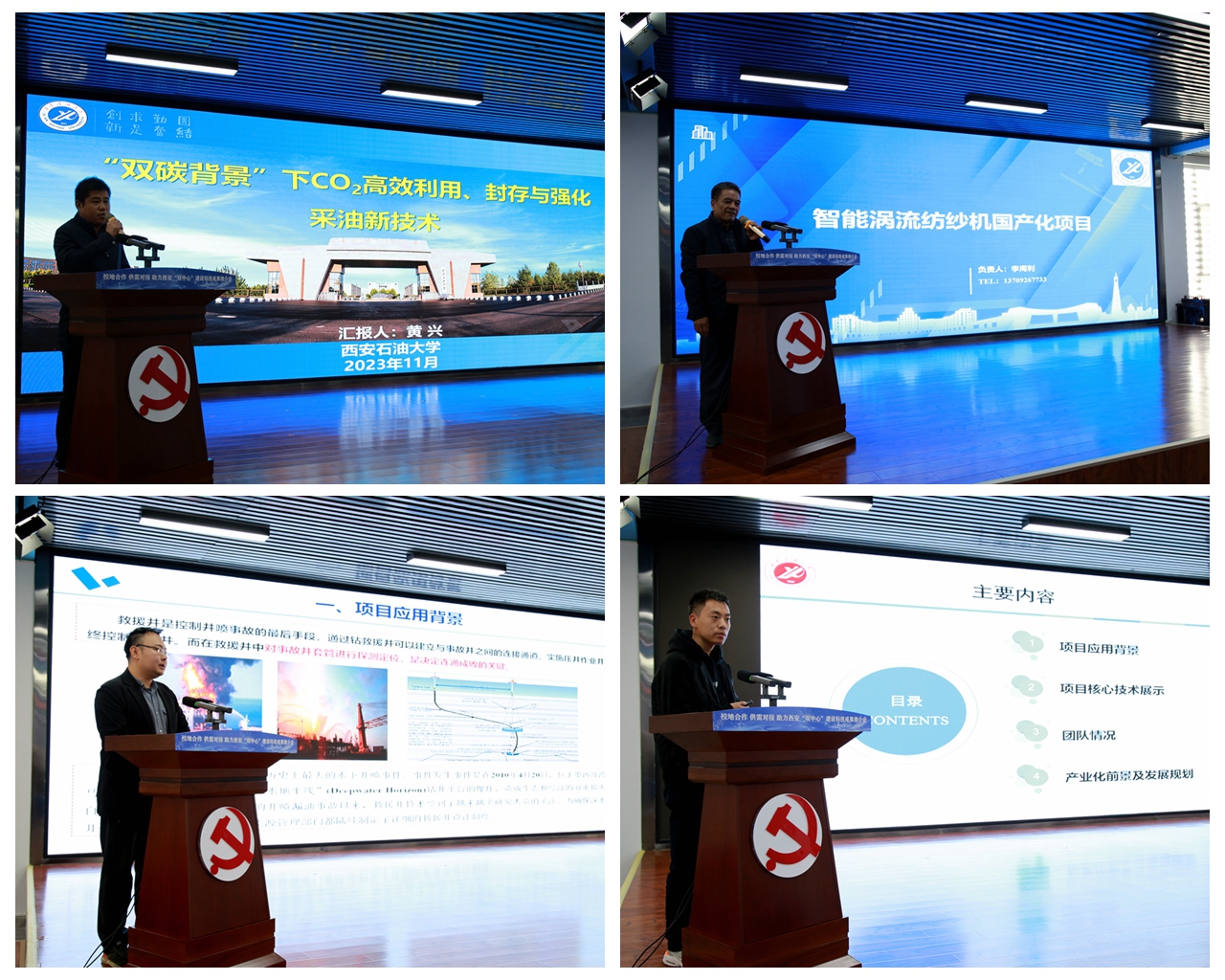 会议期间,沣京工业园管委会党工委书记王鹏涛介绍了beat365正版唯一官网科技成果转化基地的服务保障政策,为科研团队成果转化落地提供良好的创业环境。石油工程学院黄兴教授,电子工程学院李周利教授、党博教授以及材料科学与工程学院翟文彦博士结合多年科技攻关和技术沉淀,分别就“双碳背景”下二氧化碳高效利用、封存与强化采油新技术,智能涡流纺纱机国产化,特种定向井电磁探测定位技术,先进抗磨耐蚀复合材料技术等展示和推介。
