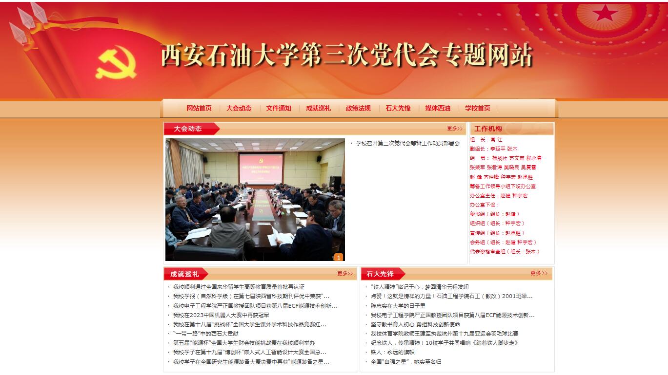 专题网站包括“大会动态”“文件通知”“成就巡礼”“政策法规”“石大先锋”“媒体西油”等栏目,将集中展示学校第二次党代会以来党的建设、教学科研、学风建设、人才培养、管理服务等方面取得的重要成就和宝贵经验;全面报道beat365官网第三次党代会的筹备情况和召开盛况;及时反映各基层党组织迎接党代会召开以及学习贯彻落实党代会精神的情况,先进基层党组织、优秀党员的典型事迹;全面宣传本次党代会制定的学校发展规划、奋斗目标和主要任务。