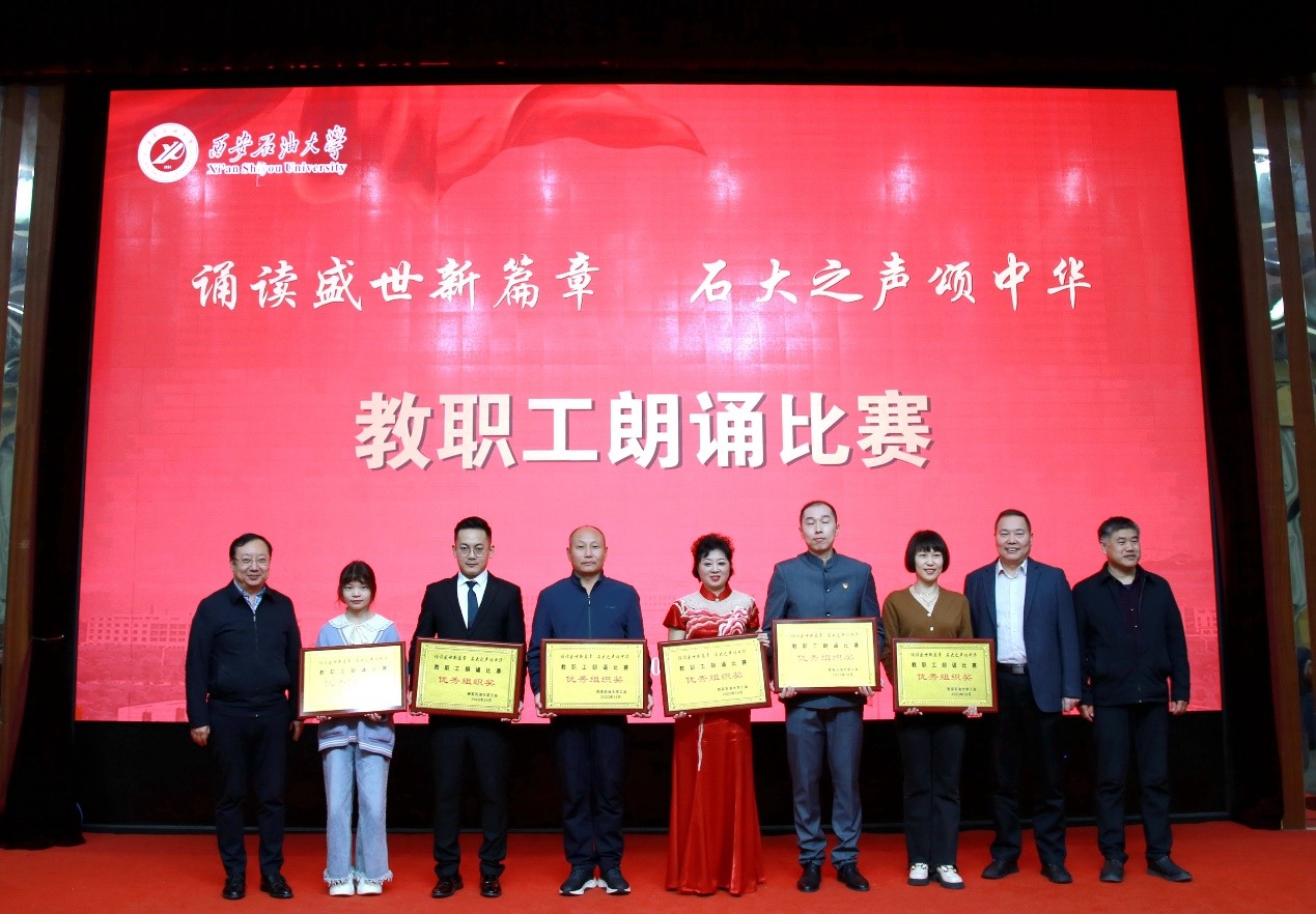 比赛在教职工舞蹈协会的开场舞《我愿全速奔向你》中拉开序幕。参赛选手或个人或集体表演,《奋进新时代,筑梦新征程》《巍巍中华》《你好,新时代》《石油之歌献祖国》《我和我的祖国》《伟大复兴》《大写的中国》《祖国啊,我为你自豪》的参赛选手们铿锵有力,都以饱满的热情倾诉着对祖国的绵绵深情;《贺百年盛会谱东方华章—传承铁人精神踔厉奋进电工院》《筑梦新时代》《密码》《中华少年》《以时代之眼,我们这样看中国》《石油之歌》《唱响新时代》的朗诵者们声情并茂、慷慨激昂地表达永远跟党走的坚定信念;《有那么一群人》《党旗飘飘》《党的二十大之歌》《浓墨重彩绘新世》《我的南方和北方》《回答》《百年芳华》的选手们真情流露,字字婉转却直抵人心。参赛选手把对党和祖国的感情表达得淋漓尽致,展示了西石大人凝心聚力、砥砺前行的精神风貌。比赛在由参赛选手带来的《我和我的祖国》歌声中落下帷幕。最终经济管理学院工会荣获一等奖,化学化工学院工会、电子工程学院工会荣获二等奖,人文学院工会、马克思主义学院工会、机关一工会荣获三等奖。经济管理学院工会、电子工程学院工会、音乐系工会、机关五工会、理学院工会、机关六工会获得本次比赛的优秀组织奖,12个参赛单位获得优胜奖。常江、苏文甫分别为荣获一等奖和二等奖的单位颁奖。