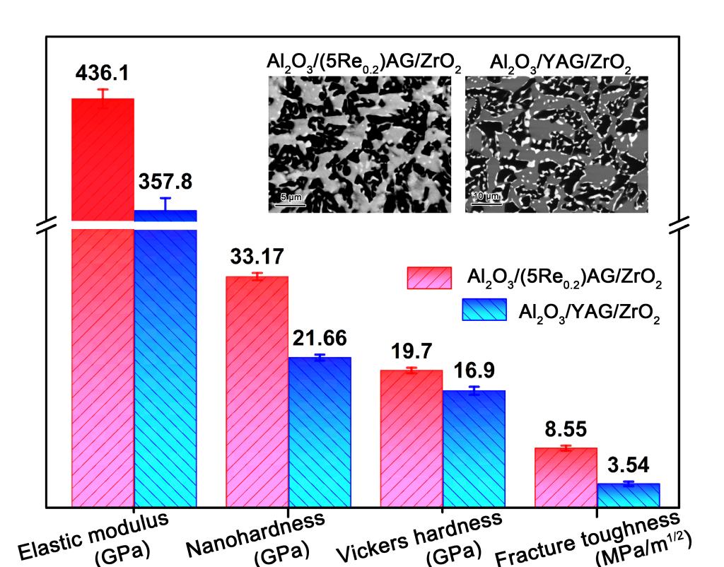 图1 Al2O3/(5Re0.2)AG/ZrO2和Al2O3/YAG/ZrO2三元共晶复合材料的形貌和力学性能比较