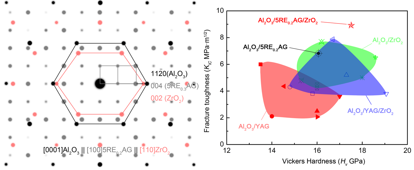 图2 籽晶法制备Al2O3/(5Re0.2)AG/ZrO2共晶陶瓷的择优取向和界面关系模拟图(左图)和氧化铝基共晶陶瓷力学性能对比图(右图)