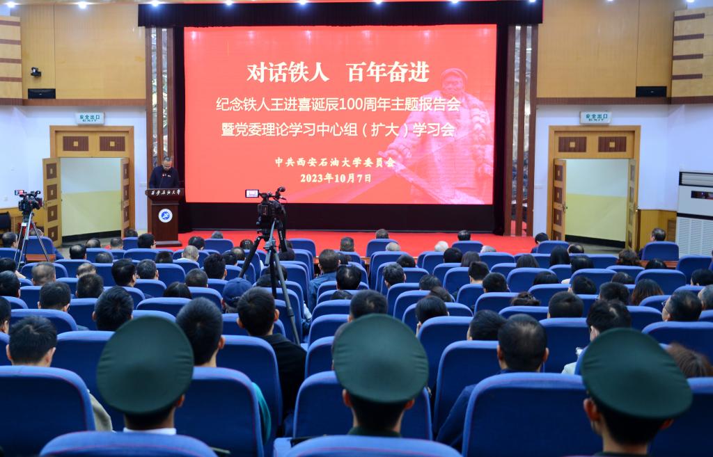 2023年10月8日是铁人王进喜同志诞辰100周年纪念日,在全党开展学习贯彻习近平新时代中国特色社会主义思想主题教育之际,在铁人诞辰100周年这个重要节点,10月7日上午,学校纪念铁人王进喜诞辰100周年主题报告会暨党委理论学习中心组(扩大)学习会在雁塔校区会议中心学术报告厅举行,以此纪念铁人王进喜同志,激励全体师生员工进一步弘扬铁人精神,传承红色基因,凝聚奋进力量。校党政领导班子成员参加活动。会议由校党委副书记、纪委书记、监察专员李延平主持。
