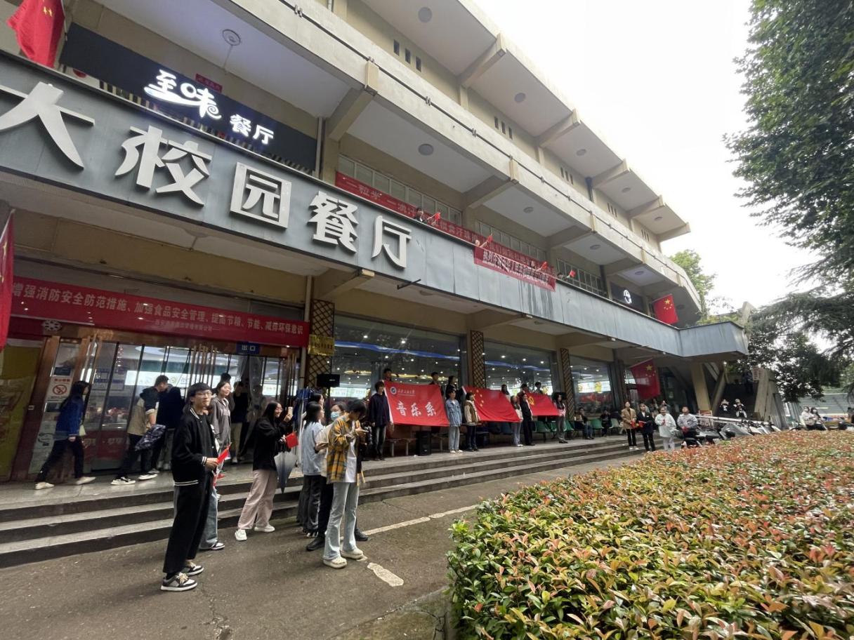 伴随着欢快的音乐声,中午12点10分,参加快闪活动的学生们从四处聚拢到餐厅前,首先以合奏的形式演绎了《我和我的祖国》,在优美的旋律中,学生饱含深情地演唱了《万江》《小白杨》《大红公鸡毛腿腿》《欢聚一堂》,用歌声致敬伟大的党、伟大的祖国和伟大的时代,用饱满的热情、嘹亮的歌声、铿锵的节拍抒发自身的报国之志。最后师生集体合唱了校歌《辉煌明天》,用歌声抒发心中爱国热忱,用镜头向祖国母亲告白。活动在师生们“祝祖国母亲生日快乐”的欢呼声中圆满结束。