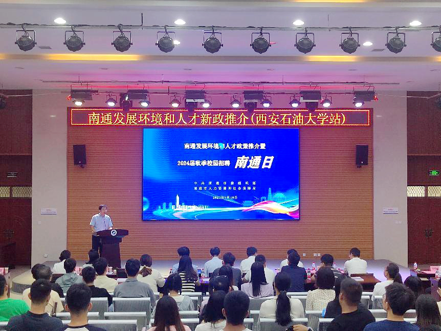张木致欢迎词,对江苏省、南通市人社部门及招聘企业的到来表示热烈欢迎,详细介绍了学校概况及2024届毕业生生源情况。他表示,南通市拥有独特的区位优势和广阔的就业市场,对高校毕业生人才具有强大的吸引力。西安市作为西部教育重镇,拥有巨大的人才体量,“你有位、我有才”就能珠联璧合。南通市坚持人才优先发展战略不动摇,进一步优化顶层设计,全力推进人才体制机制创新,着力破除制约人才发展的制度藩篱和政策壁垒,大力吸引人才来通就业创业,全市人才发展环境明显优化,区域人才竞争力显著提升,引才聚才效应不断凸显,人才成为推动南通产业升级和科技竞争力全面提升的“助推剂”。在此,他诚挚邀请南通市领导、对口企业来校开展各类人才供需对接活动,不断深化校地、校企合作,并祝愿南通市能“聚贤汇能”“人才通达”。