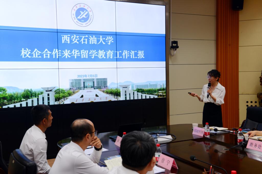 国际教育学院负责人从学校国际化工作介绍、来华留学生发展概况、中塔中吉项目汇报等三个方面详细汇报了校企合作项目来华留学生教育工作。