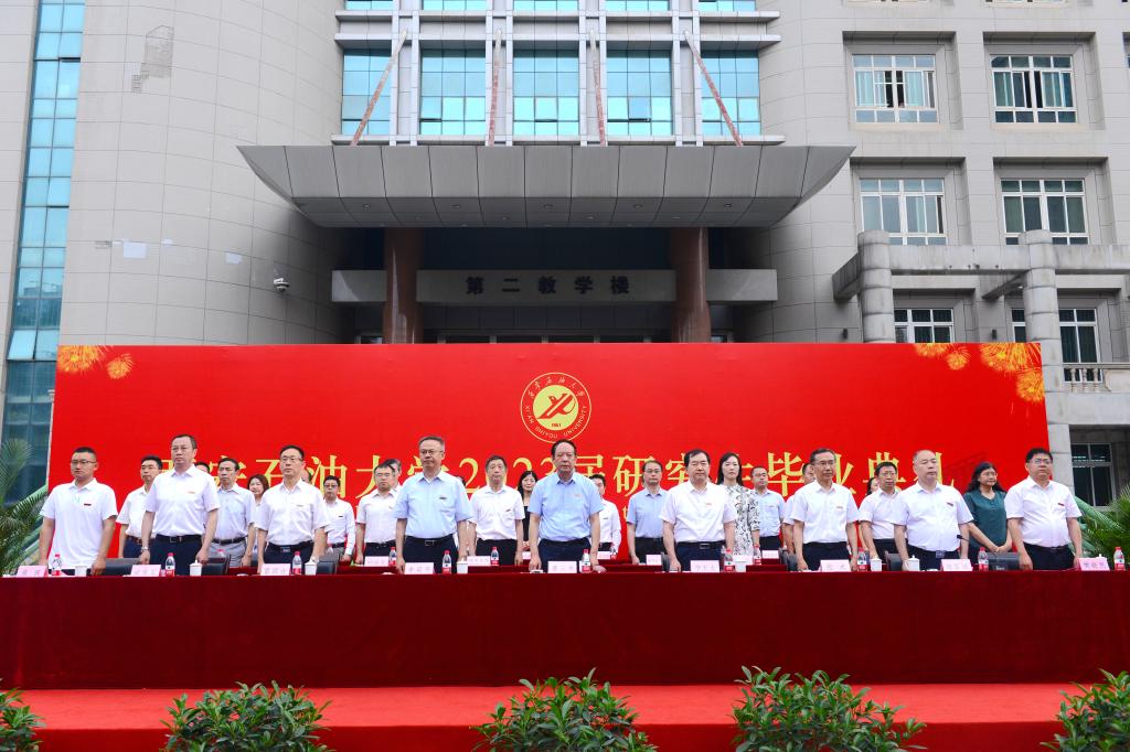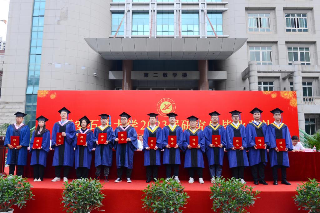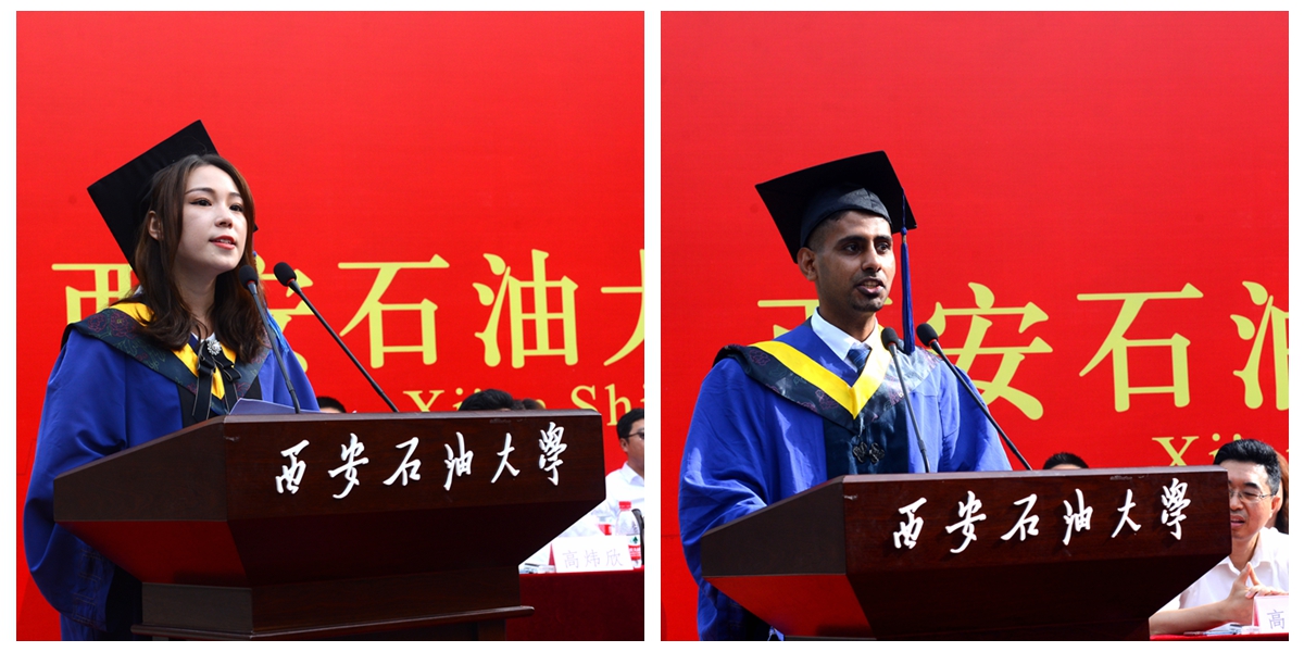 石油工程学院油气田开发工程专业张洋同学和机械工程学院机械制造及其自动化专业留学生海桑同学分别代表毕业研究生发言,他们分享了研究生阶段的成长经历和收获,表达了对母校和老师的感恩之情以及立志奋发努力、勇敢前行的信心和勇气。