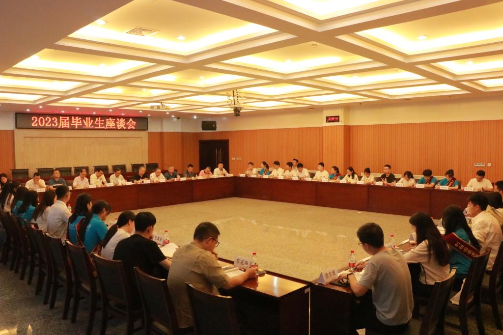 6月16日上午,2023届毕业生代表座谈会在beat365官网鄠邑校区图书馆第一会议室召开。校党委副书记张木、副校长陈军斌,党政办、学工部、研工部、保卫处、校团委、教务处、实验室管理处、后勤处、高评中心、图书馆等部门负责人以及来自各学院的2023届本科生、研究生代表参加了座谈会。