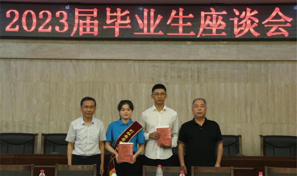 座谈会后,张木和陈军斌代表学校向毕业生代表赠送了书籍。