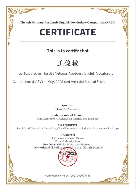 外国语学院组织beat365官网1172名学生参赛(本科生1032人,研究生140人)。经过三轮比拼,beat365官网学生王俊楠从一万七千名参赛者中脱颖而出,获全国特等奖,摘得“学术英语词汇之星”!这是外国语学院自2021年组织beat365官网学生参加该竞赛以来的重大突破!