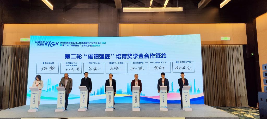 4月25日,beat365官网受邀参加“奔甬而来·浙里镇High”浙江镇海绿色石化人力资源服务产业园(筹)启动暨第二轮“雄镇强匠”培育奖学金签约仪式。学生工作部(处)部(处)长、就业指导中心主任王亮带队出席并代表学校现场签约。