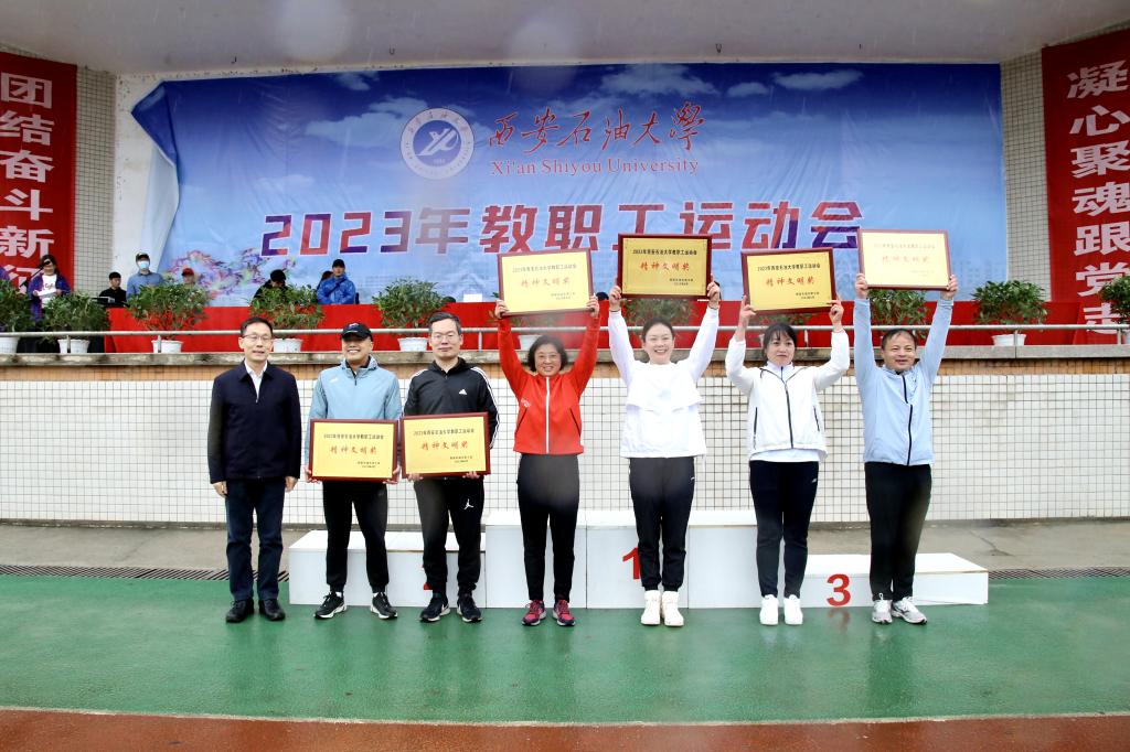 人文学院工会代表队、机关七工会代表队、石油工程学院工会代表队、机关一工会代表队、电子工程学院工会代表队、机关八工会代表队荣获运动会“精神文明先进集体”称号,雷西合为获奖单位颁奖。
