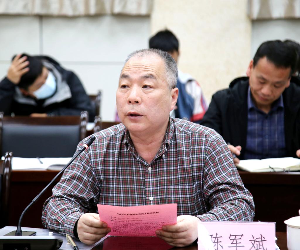 陈军斌分析了学校的学科优势和专业特色,强调了招生面临的机遇与挑战,就当前招生宣传工作提出四点要求:一是要强化招生宣传队伍建设,选拔政治素质高、责任心强、学术水平高、有奉献精神的教师进入招生宣传组,充分发挥专家教授专业优势,提升招生宣传质量和咨询服务能力;二是要加强专业内涵建设,充分发挥招生-培养-就业联动机制作用,完善专业动态调整机制,以国家战略和市场需求为导向,优化专业布局,深化“四新”建设,加速传统学科专业升级改造,培养适应经济社会发展需要的高素质专门人才;三是要推进生源基地建设与维护,积极走访生源中学,了解中学需求,开展专业科普讲座、生涯规划指导,邀请中学师生代表来访研学,通过“走出去”“引进来”方式,增进互动交流,扩大学校社会影响力;四是要拓宽招生宣传渠道,创新招生宣传方式,发挥新媒体优势,打造全媒体宣传矩阵,借助社会主流媒体,强化宣传力度,线上线下共同发力、密切配合,强化宣传材料的传播效果,提供全面周到的咨询服务。