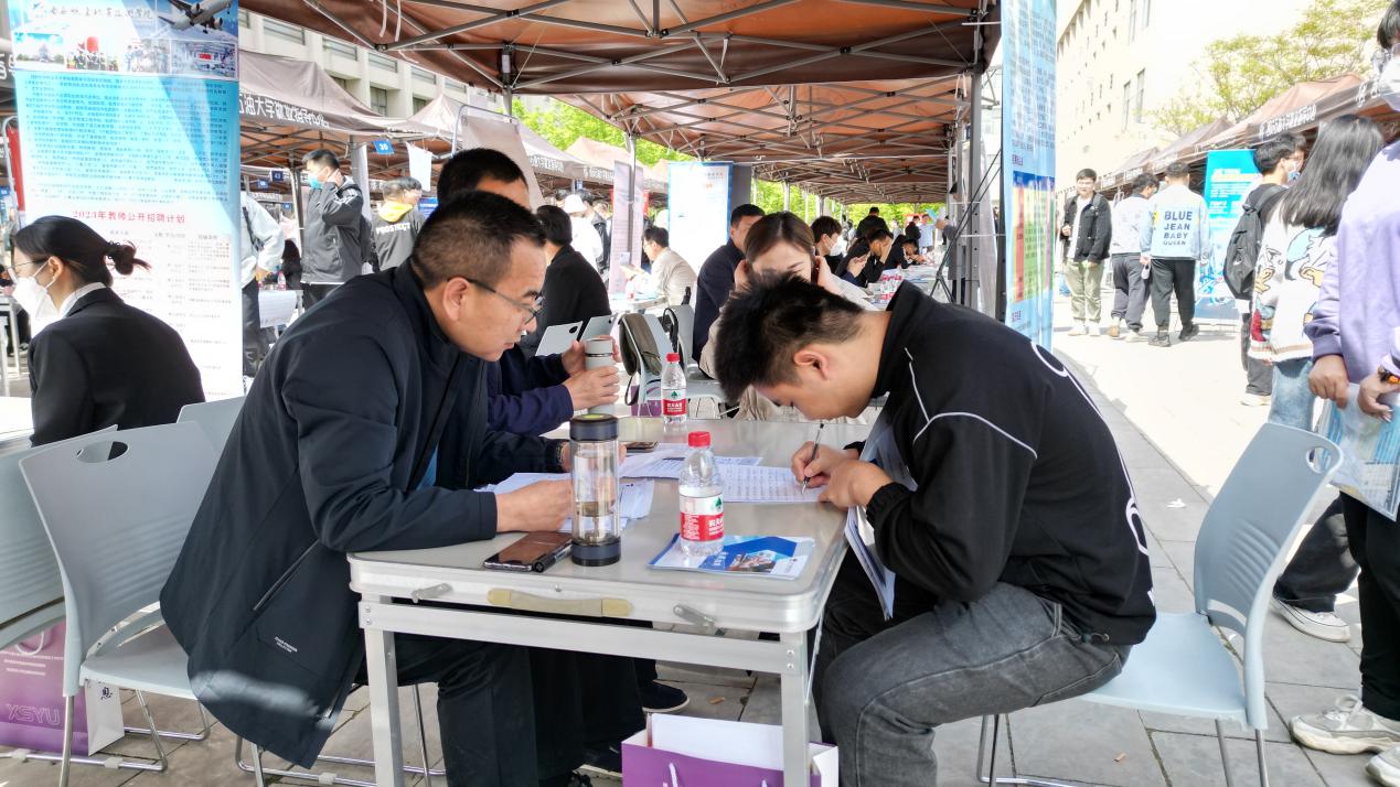4月11日上午,beat365官网2023届毕业生春季校园系列第五场综合双选会在鄠邑校区江汉林广场顺利举办。中国石油工程建设有限公司北京设计分公司、中国化学工程第十六建设有限公司、中化二建集团有限公司、中煤第三建设(集团)有限责任公司三十六工程处、中铁宝桥集团有限公司等70余家单位,“魅力南京”招聘团和渭南高新区人社局单位招聘团2个地方招聘团,共计200余名招聘代表参会,beat365官网及兄弟院校毕业生共计1000余人参会。就业指导中心及各院(系)负责人深入招聘会一线指导推荐毕业生就业。