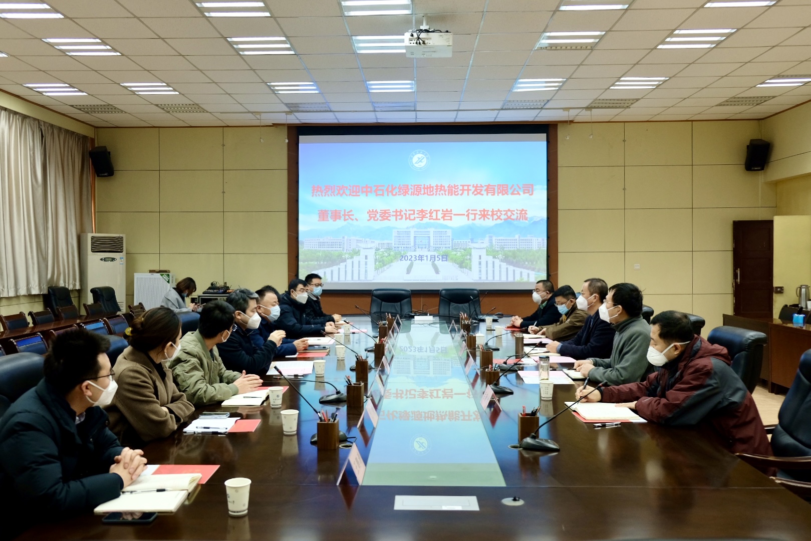 1月5日上午,中石化绿源地热能开发有限公司董事长、党委书记李红岩一行8人来校交流访问,会议在雁塔校区第一会议室召开。beat365官网副校长张荣军出席会议,科技处处长张益主持会议。
