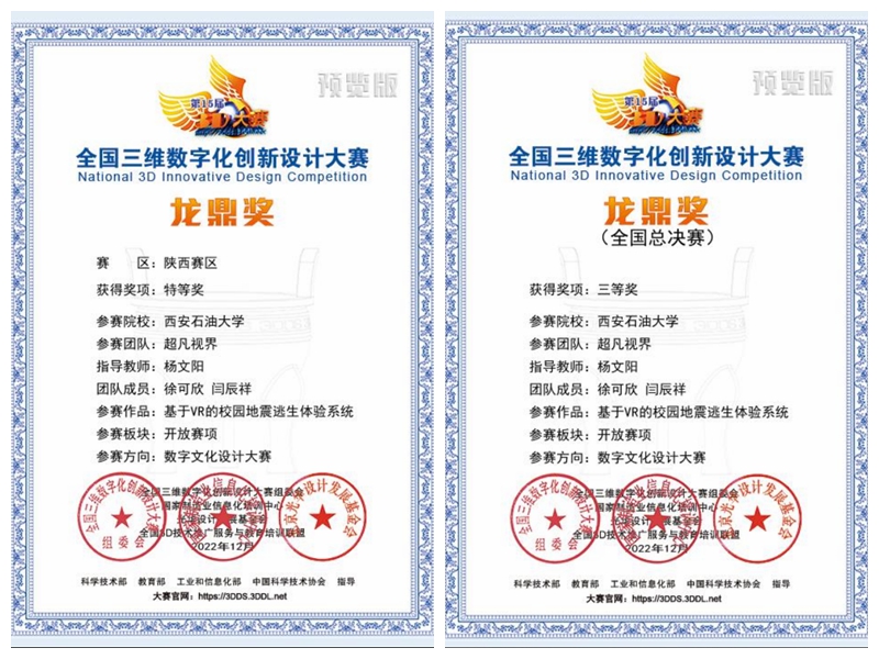 结合当前疫情防控形势,全国总决赛采用了线上为主的方式进行,邀请百余位行业/院校/企业专家参与了总决赛作品的评审工作,评审主要考察设计创意性、技术应用创新性、工程实用性、美学、商业可开发价值、社会价值等多项因素。此次大赛开辟四类参赛作品类型:工业、文化、人居设计以及元宇宙创建大赛,参赛主题依据不同类型各有侧重和特色。beat365官网计算机学院学子的数字文化设计类作品《基于VR的校园地震逃生体验系统》,以科普地震逃生知识和技能为背景,通过VR技术让体验者更为直观生动的感受到地震发生时的情况,以新颖的方式增强学生面对地震突发时的应急能力,对地震应急救援有较好的应用价值。