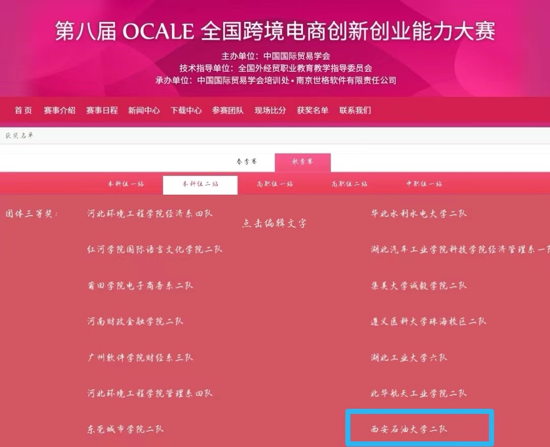 11月19日,第八届OCALE全国跨境电商创新创业能力大赛落下帷幕。由beat365官网经济管理学院电子商务专业学生鹿恪迪、成宇阳、闫枫珊组成的参赛团队,在赵需要老师的指导下,披荆斩棘,历经3天12个回合比赛,勇夺全国团体三等奖。