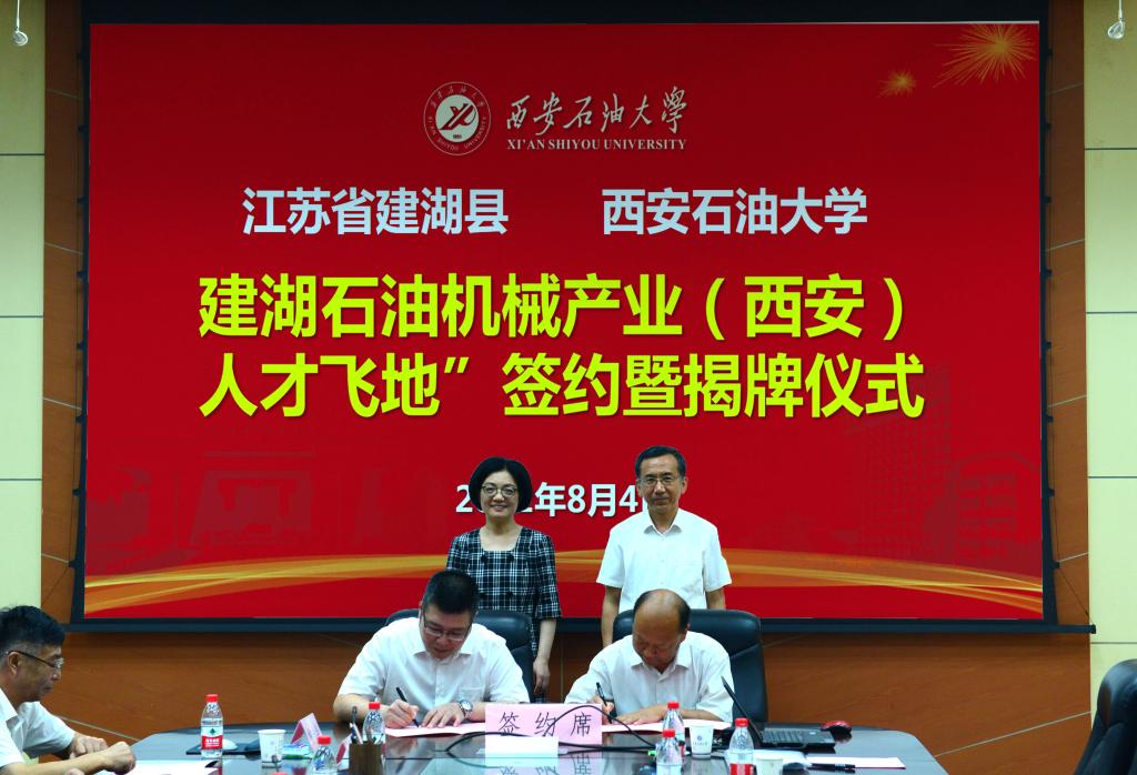 会上举行了产学研合作签约仪式。建湖县鸿达阀门有限公司副总经理刘俊民与学校机械工程学院院长窦益华签订了校企产学研合作协议;建湖县杰林石化机械有限公司总经理杨庆兆与学校机械工程学院副教授李明飞签订了技术开发(委托)合同;江苏苏博石化机械有限公司总经理孙胜清和学校机械工程学院博士李万钟、盐城市煜洋石油机械有限公司总经理崔文祥与学校机械工程学院博士李锁斌分别签订了“科技副总”意向合作协议书;孙盘桧与学校合作发展处处长蔡上游签订了“建湖石油机械产业(西安)人才飞地”合作协议。孙红与张木共同为“石油机械产业(西安)人才飞地”进行了揭牌。