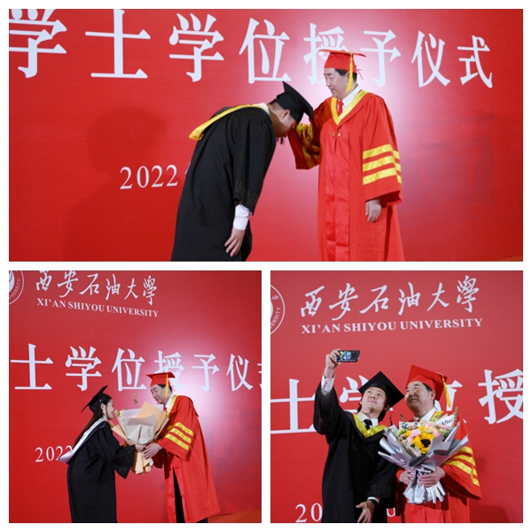 在昂扬激越的乐曲声中,李天太为每位同学授予学位。即将被授予学位的同学趋前向校长行鞠躬礼,校长与同学们亲切握手、拥抱并将学士学位证书颁发给同学,为每位同学拨正学位冠上的流苏,并与每位同学合影留念。近1个半个小时的授位仪式中,报告厅内不时爆发出阵阵掌声和欢呼声,毕业生的兴奋之情溢于言表。