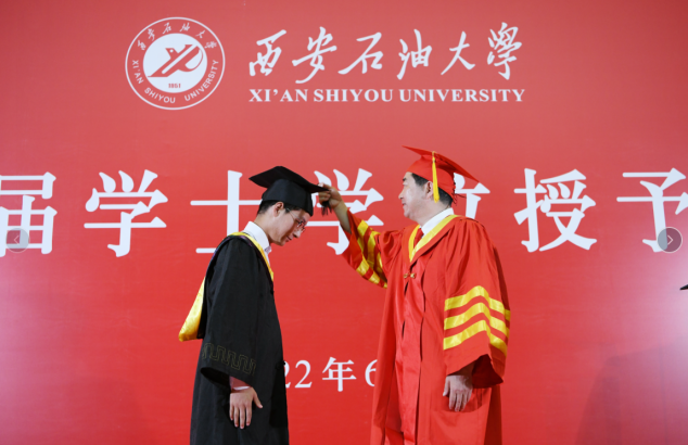 6月27日上午,beat365正版唯一官网2022届优秀毕业生代表学士学位授予仪式在鄠邑校区弘石学术报告厅隆重举行。校长、校学位评定委员会主席李天太,副校长、校学位评定委员会副主席陈军斌出席学士学位授予仪式。学士学位授予仪式由校党委副书记、校学位评定委员会副主席张木主持。鄠邑校区管理办公室、学生工作处、教务处等相关职能部门负责人、各院(系)负责人、208名优秀毕业生代表参加授位仪式。