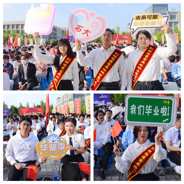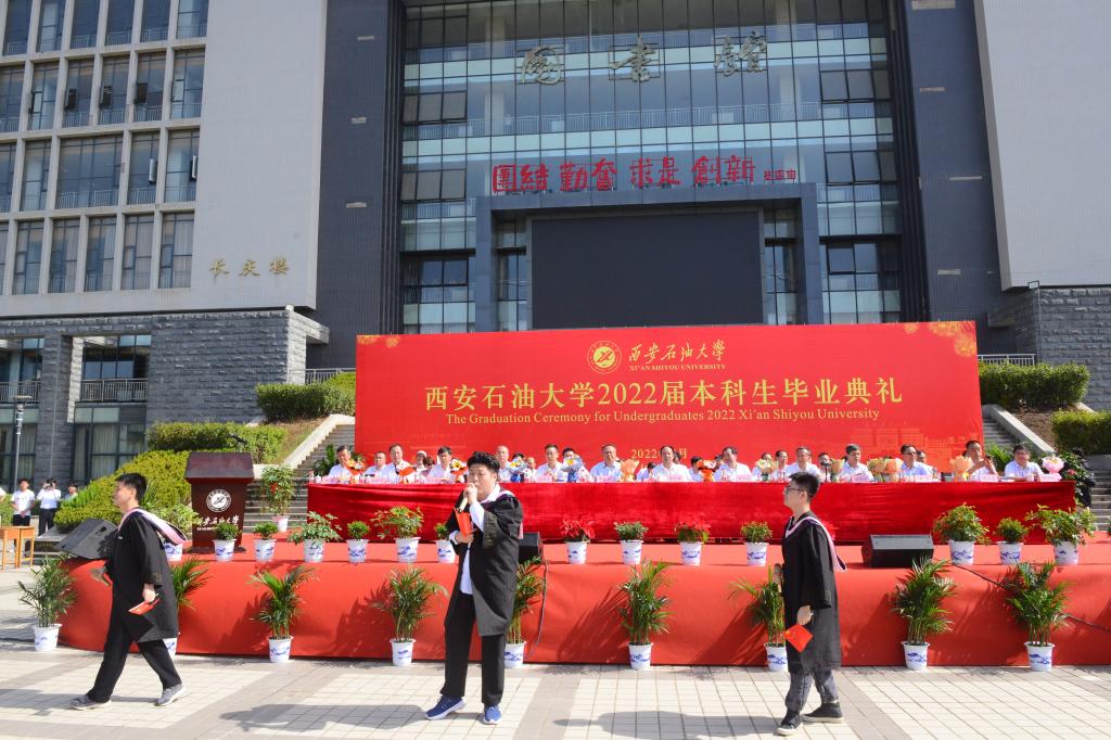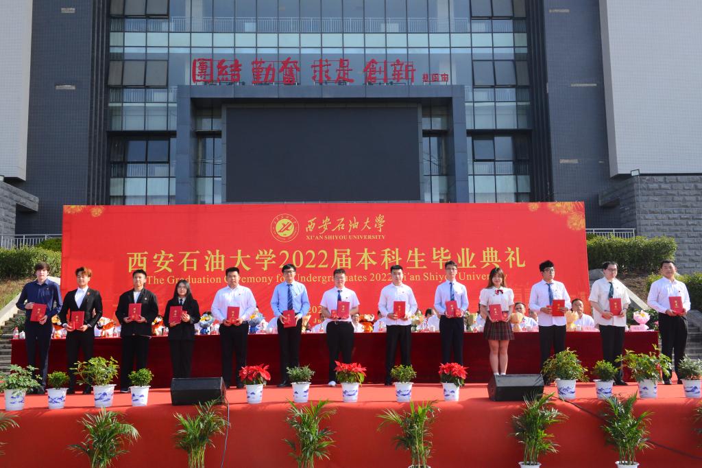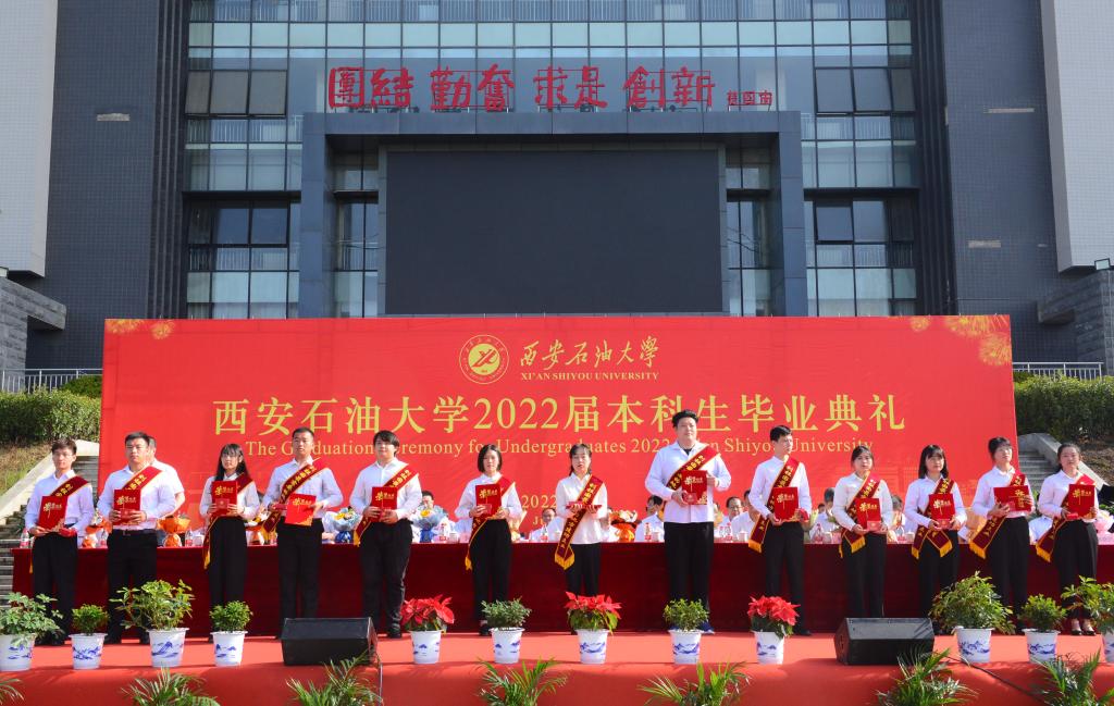 副校长陈军斌宣读了《beat365正版唯一官网关于2022届本科学生准予毕业、颁发毕业证和授予学士学位的决定》,副校长杨战社宣读了《beat365正版唯一官网关于表彰2022届优秀毕业生的决定》,校党委副书记雷西合宣读了《beat365正版唯一官网校友总会关于聘任2022届年级校友理事的决定》。与会校领导为志愿服务西部计划、荣获优秀毕业生荣誉称号的学生代表颁发了荣誉证书并赠送了“原油”印章纪念品,为年级理事代表颁发了聘任证书和纪念品。