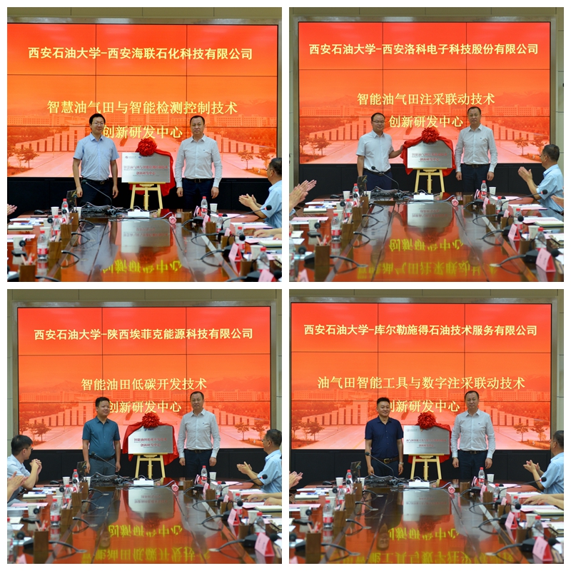 张荣军代表beat365正版唯一官网分别与四家企业的总经理为beat365正版唯一官网与四家公司的“智慧油气田与智能检测控制技术创新研发中心”“智能油气田注采联动技术创新研发中心”“智能油田低碳开发技术创新研发中心”“油气田智能工具与数字注采联动技术创新研发中心”进行揭牌,正式开启与四家公司的产学研合作。学校还与四家企业还签订了“研究生联合培养基地”。