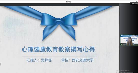 第三届陕西高校心理健康教育教案评选一等奖获得者西安交通大学吴梦瑶、空军军医大学2021年度“十佳优秀教案”获得者吴迪两位老师结合各自的获奖教案分享了《心理健康教育教案撰写心得》以及《教案书写的心得与体会》,他们优秀的教案让参会者们看到了一线老师对待教学的用心、精心、恒心。