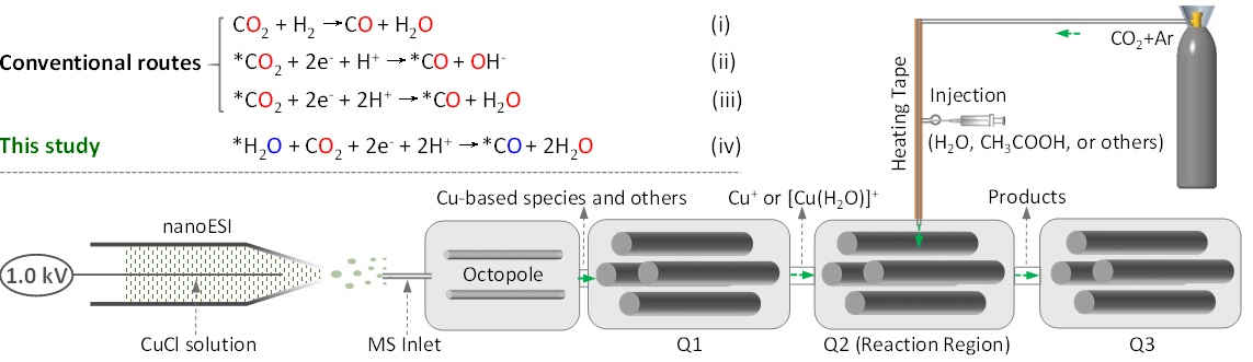 按照传统观点,二氧化碳还原转化为一氧化碳中的O原子来自二氧化碳。该研究中,科研人员发现还原反应生成一氧化碳中的O原子来自反应体系催化剂表面的配位水分子,而非二氧化碳本身。该结论不仅适用于质在线反应过程,也适用于实际二氧化碳的电催化还原反应和工业化水煤气逆反应过程,说明该发现具有一定的普适性。同时发现相比于金属催化剂Cu+,当[Cu(H2O)]+作为催化剂时,二氧化碳还原为一氧化碳的反应效率可提高两个数量级。为了深入探究该反应过程,科研人员通过改造质谱仪对反应中间体的捕获、同位素对比实验和密度泛函理论的计算,详细阐述了二氧化碳在[Cu(H2O)]+催化作用下生成一氧化碳的机制。该工作不仅为深入阐述二氧化碳还原机理提供了方法学基础,也为详细了解水在二氧化碳还原过程中的作用提供了着眼点。