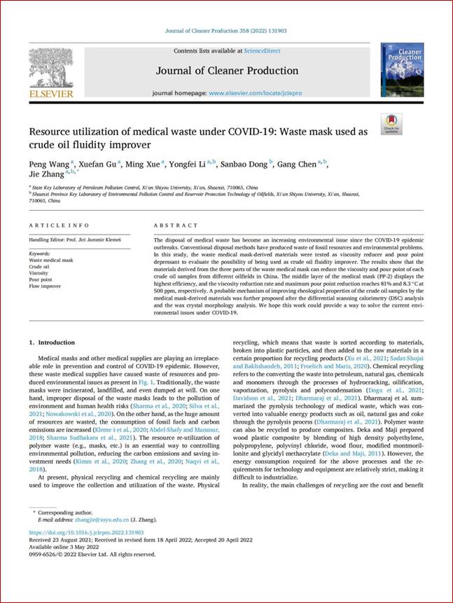 该项研究工作近期以“Resource utilization of medical waste under COVID-19: Waste mask used as crude oil fluidity improver”为题发表在Journal of Cleaner Production(中科院一区,TOP期刊,2021年IF=9.297)期刊上。张洁教授和顾雪凡教授共同指导,硕士研究生王棚为论文第一作者,张洁教授为通讯作者,beat365正版唯一官网为第一单位。