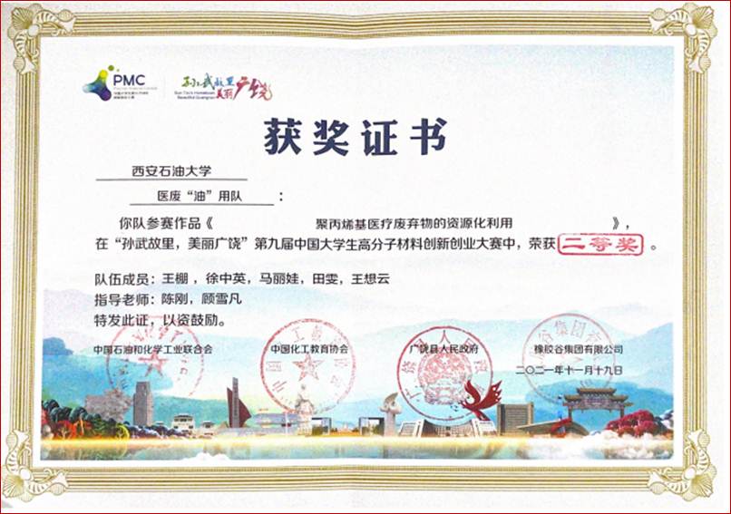 基于该课题的研究工作,已经先后获得第十四届全国大学生节能减排社会实践与科技竞赛三等奖、第九届中国大学生高分子材料创新创业大赛二等奖。