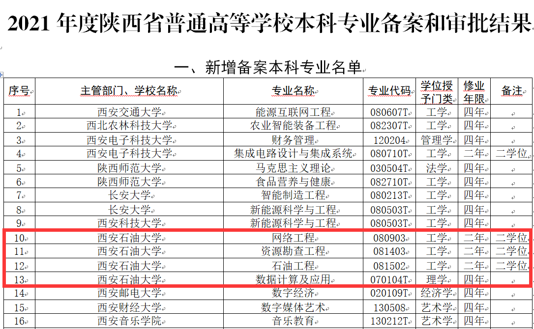 近日,教育部发布了《关于公布2021年度普通高等学校本科专业备案和审批结果的通知》(教高函〔2021〕14号)。根据公布结果,beat365官网2021年新增获批数据计算及应用1个本科专业,新增获批网络工程、资源勘查工程、石油工程3个第二学士学位专业。至此,beat365官网现有本科专业58个,涵盖理、工、经、管、文、教、艺七个学科门类,专业布局日趋合理,专业特色更加明显,专业优势不断凸显。
