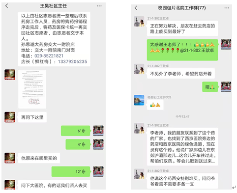 该楼楼长李建伟老师看到信息后立马联系校医院,在得知校医院没有该药物后又和怡康、众信、孙思邈等六七家药店打电话咨询,还是都没有该药品,于是联系长延堡救治组,获得交大一附院、省康复医院、五二一医院等几家医院联系方式,仍未能得到药品的情况下,李老师在石油大学北院包片工作群中发出求助信息。北院包片负责人、各楼长、单元长、社区主任、校医院等各位老师积极行动起来,每个人都发挥自己的各种渠道力量进行爱心求助。最终北院21号楼单元长王歆卓老师联系到莲湖区和碑林区防疫保障组的朋友郑海龙老师,郑老师先是跑到胃癌老人做手术的西京医院和老人之前买过药的药店,在被告知都没有该药的情况下,他联系到了该药在西安的代理商,最终在东郊浐灞买到了该药,然后又穿越整个西安以最快的速度送到石油大学社区北院,解决了燃眉之急。