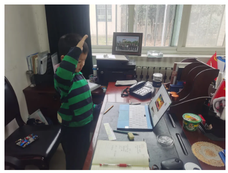刘念喆在爸爸办公室通过网课参加新年升旗典礼
