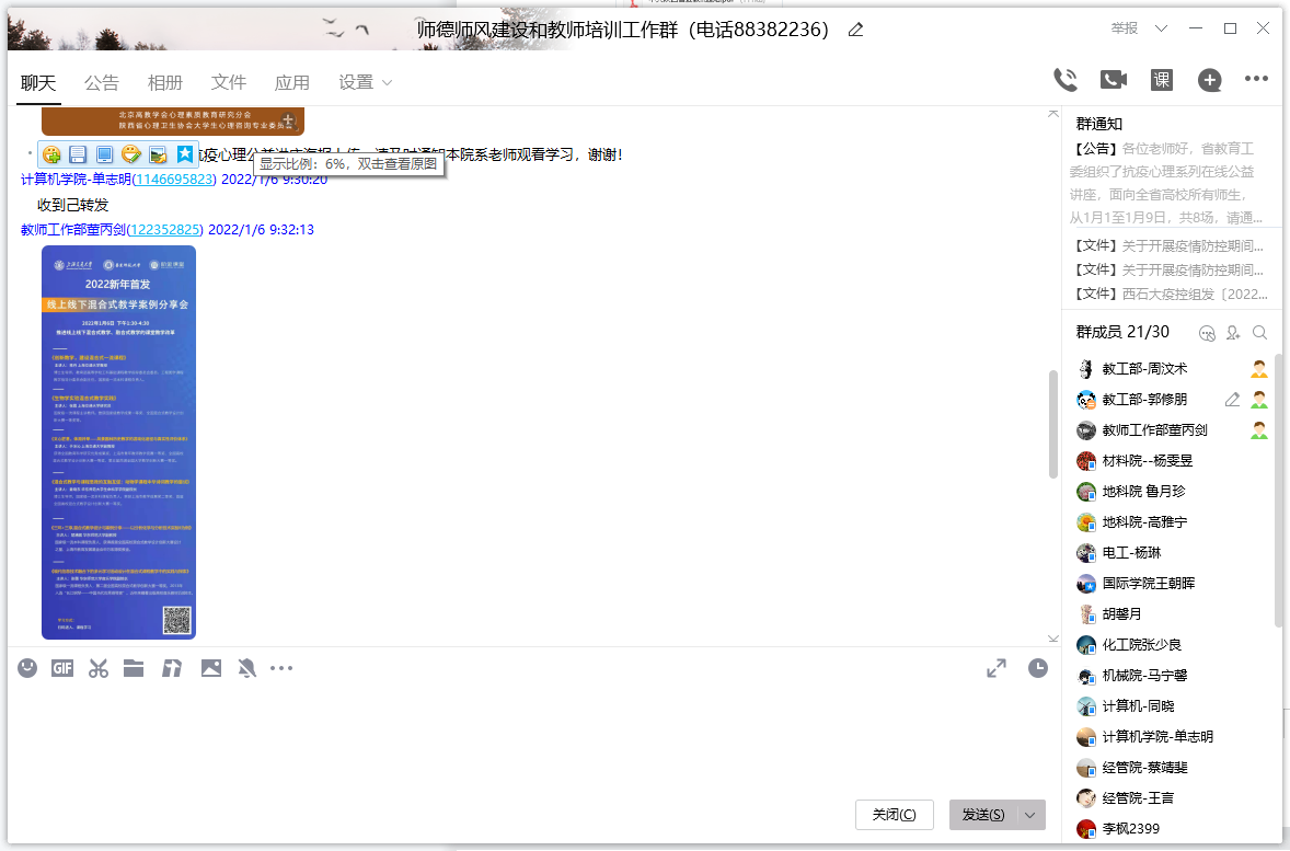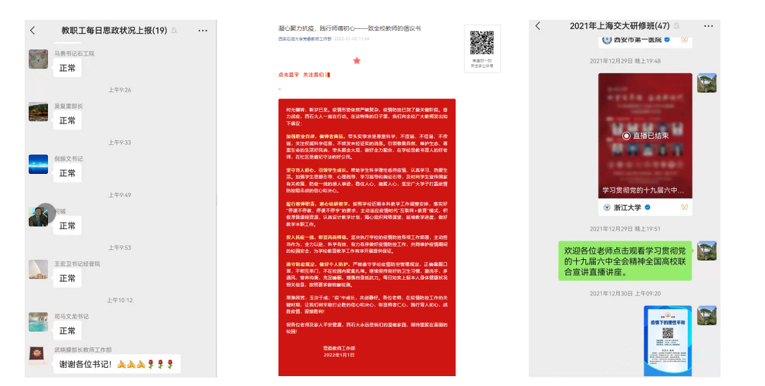 思想政治教育全覆盖,强化教职工思想引领。建立学校教职工思想政治状况信息群,各院(系)级单位党组织书记在群内每天上报本单位教职工思想政治状况,精准排查不漏一人,加强观测引导,对全校教职工思想政治状况切实做到底子清、情况明、措施实。发出《致全校教师的倡议书》,组织教师线上观看学习贯彻党的十九届六中全会精神全国高校联合宣讲直播讲座,在部门所属各教师群内转发疫情防控法律法规,教育教师在学校做好老师,在社区做好公民。