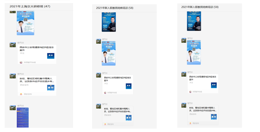 用心服务教师发展,助力育人能力提升。联合教务处组织教师开展课程思政专题网络学习,切实提升教师课程思政建设的意识和能力。按照省教育厅《关于开展疫情防控期间在线学习公益课的通知》要求,依托陕西省教育系统疫情防控期间在线学习云平台,下发学习通知,要求各单位组织管理人员和一线教师开展在线学习公益课,助力疫情防控期间“停课不停学”。转发上海交通大学、华东师范大学联合举办的“助金课堂”系列讲座和全国模范教师、北京师范大学教授、博士生导师康震教授线上讲座通知,切实提升教师教育教学能力和育人水平。