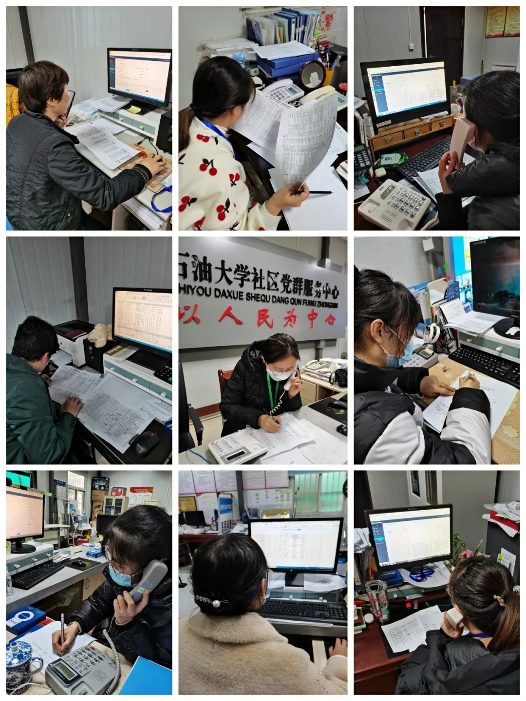 石油大学社区的工作人员密切协同兄弟部门,连续奋战在一线,开展持续的全员核酸检测工作,做到应检尽检,不漏一人。在核酸检测点上,后勤工作人员帮助维持点位秩序、落实一米线,进行数据录入、承担样本转运等工作,提高检测效率与速度,着力尽快摸清校内全员防控底数和落实做细检疫措施。同时,后勤还担负着校内疫情流调信息核查工作,社区办公室的流调人员每天要拨打几百通电话,进行逐户逐人的流调询问、核实和登记,短短几天内,已先后处理完1950条流调核查工作。