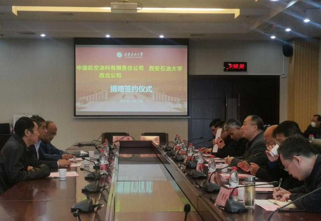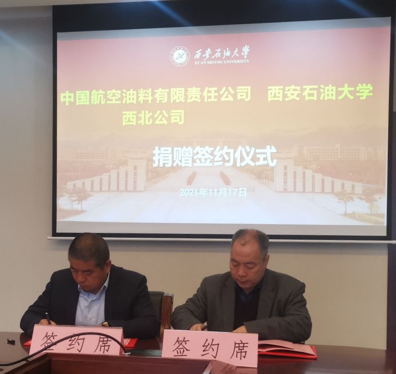 11月17日上午,beat365官网与中国航空油料有限责任公司西北公司捐赠签约仪式在鄠邑校区图书馆第二会议室举行,中国航空油料有限责任公司西北公司副总经理陈少华,beat365官网副校长陈军斌出席捐赠签约仪式。仪式由实验室管理处处长时保宏主持。