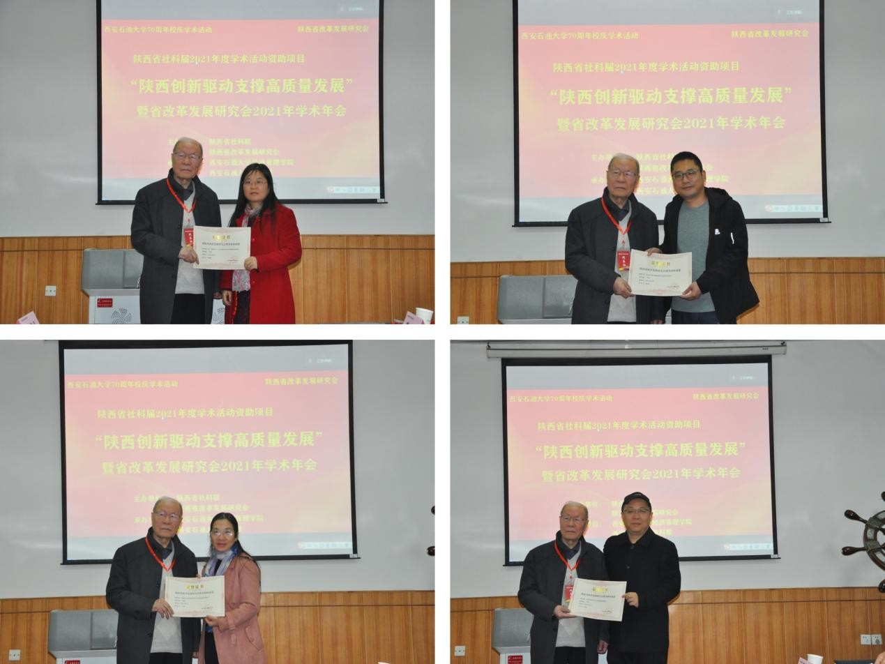 享受国务院特殊津贴专家、陕西省有突出贡献专家、陕西经贸学院原院长、西安财经大学樊光鼎教授对陕西省改革发展研究会庆祝建党100周年优秀科研成果评奖活动进行了介绍,并宣读获奖文件,与获奖代表合影留念。
