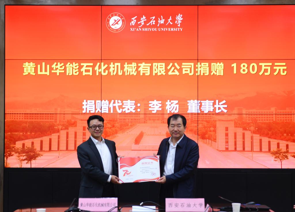 李天太校长对李杨董事长一行表示热烈欢迎,对李杨校友一直以来对学校建设发展的关心与大力支持表示感谢。他简要介绍了学校的办学历史和发展近况,以及对新能源、新材料、人工智能等发展展望。李校长表示,黄山华能石化机械有限公司长期以来与学校保持着良好的合作关系,时值学校70年校庆能慷慨捐赠助力学校建设发展,充分表达了对母校的关心关爱和支持,为学校事业发展增添了动力和活力。他希望黄山华能石化机械有限公司能以此为契机,进一步加强与学校的合作交流,一如既往地支持学校的建设发展,同时推动双方在石油钻采自动化、数字化设备及控制系统、工业智能设备、环保设备等多领域的合作。