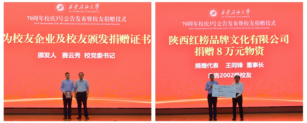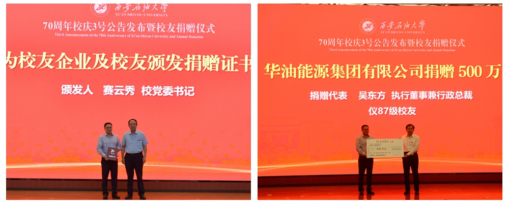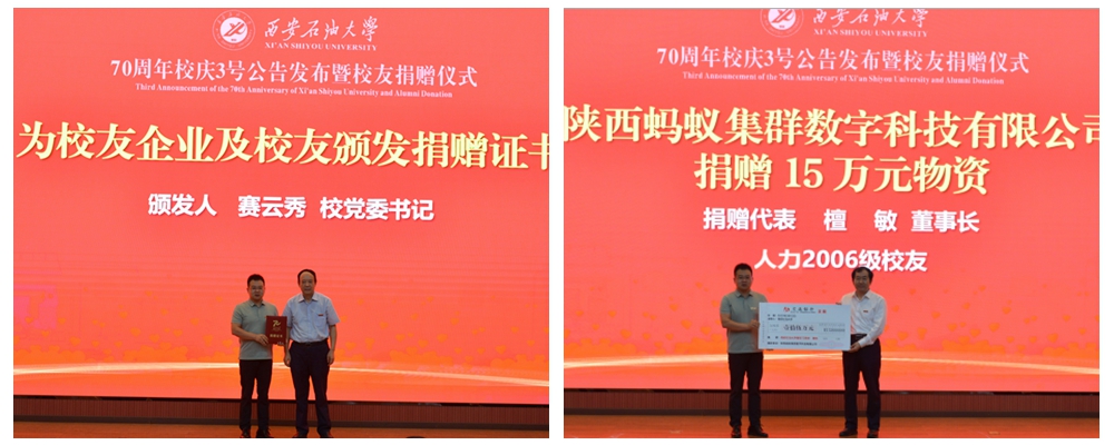 在学校建校70周年华诞来临之际,广大校友纷纷通过捐资捐物等多种形式表达对母校的深情厚谊,支持学校建设发展。在当天的捐赠仪式上,仪87级校友、华油能源集团有限公司执行董事兼行政总裁吴东方代表公司捐赠500万元;石工88级校友、陕西欧菲德环保科技有限公司总经理李熙民代表公司捐赠16万元物资;人力2006级校友、陕西蚂蚁集群数字科技有限公司董事长檀敏代表公司捐赠15万元物资;化工2002级校友王鹏宝捐赠12万元物资;矿83级校友、西安石油大佳润公司总经理杨毅代表公司捐赠10万元物资;广告2002级校友、陕西红榜品牌文化有限公司董事长王同锋代表公司捐赠8万元物资。