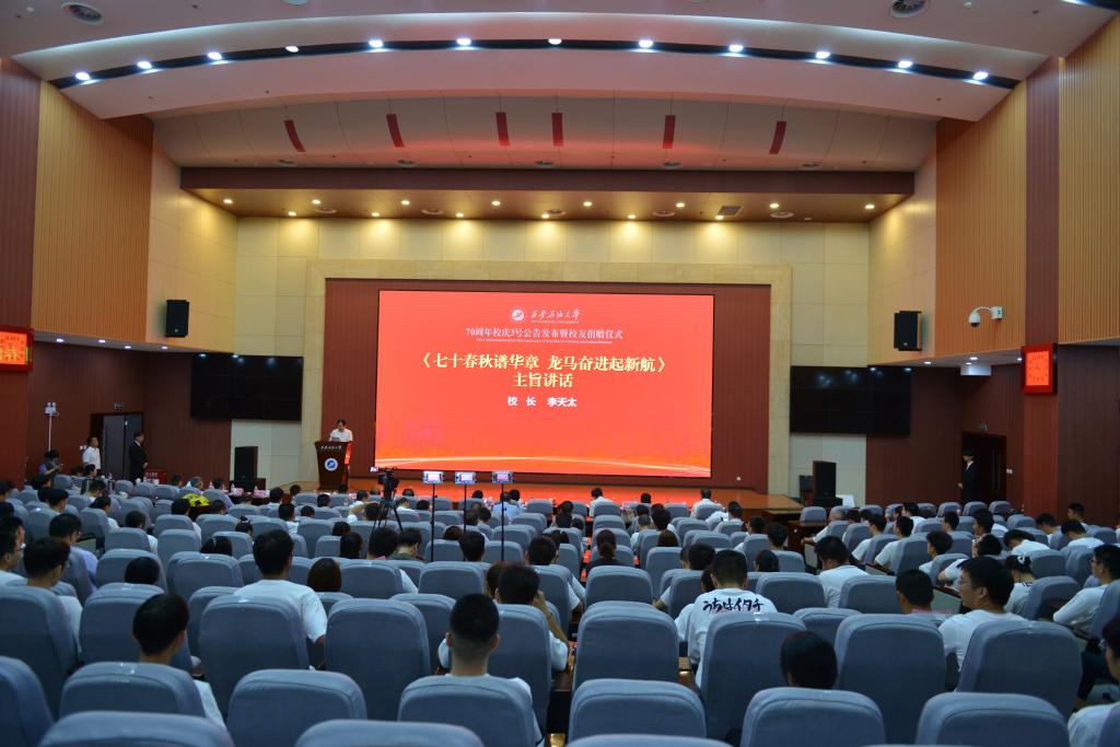 仪式上,校长李天太作了题为《七十春秋谱华章 龙马奋进起新航》的讲话。他表示,自学校70周年校庆一号、二号公告发布以来,校庆工作得到了海内外校友、社会各界人士和学校师生员工的热切关注和鼎力支持。全校紧紧围绕“校庆年”的规划和“展示办学成就、凝聚办学共识、深化办学合作”的主题,着力实现“西石大精神的传播和弘扬、师生校友的团结和凝聚、学术风气的营造和涵养、校园环境的优化和美化、办学资源的争取和激活”合力互动的工作目标,精心举办包括赓续历史、风采展示、学术交流、文化传承等各类活动,有效引领带动师生校友全面拥抱新时代、持续推进学校高水平大学建设。