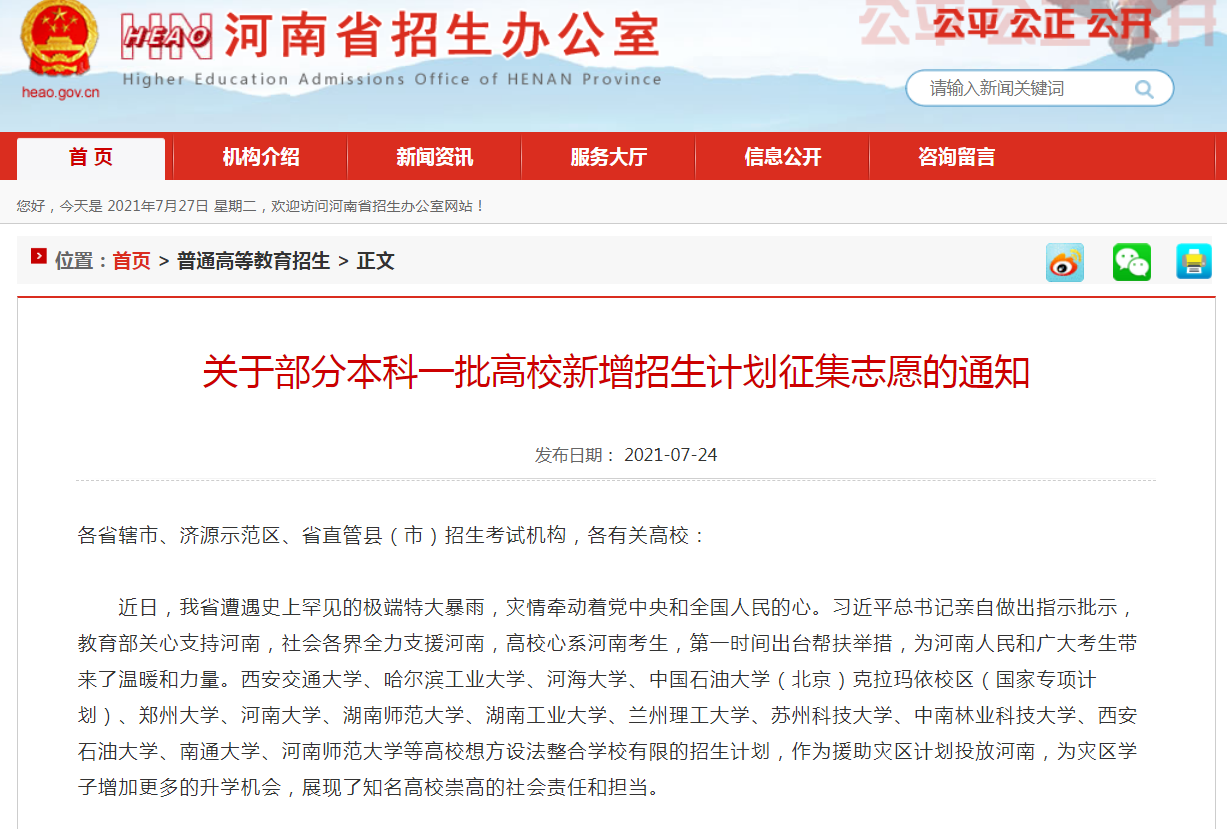 近日,河南省遭遇史上罕见的极端特大暴雨,灾情牵动着党中央和全国人民的心。习近平总书记亲自做出指示批示,教育部关心支持河南,社会各界全力支援河南。beat365正版唯一官网也心系河南考生,第一时间出台关心帮扶举措,整合学校有限的招生计划,紧急调拨3个本科一批救灾专项招生计划(机械设计制造及其自动化2个、计算机类1个)投放河南,为灾区学子增加更多的升学机会,以实际行动支援河南。