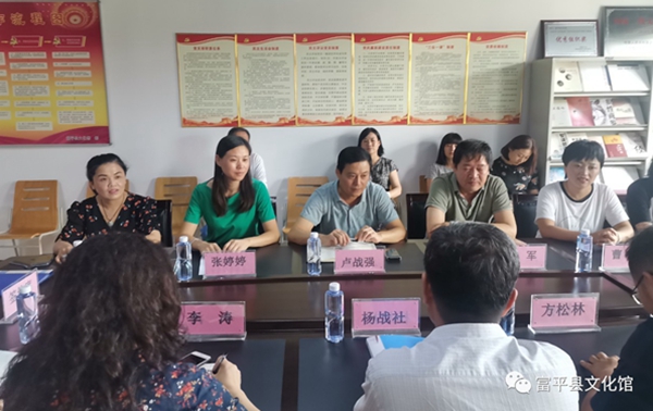 在富平县文化馆,杨战社副校长一行与富平县文化和旅游局局长卢战强、副书记吴军、副局长文化馆馆长张婷婷等就红色文化的传承与传播、区域文化特色的凝练进行了座谈,然后一起参加了实践基地揭牌仪式。卢战强局长介绍了富平县文化和旅游产业的发展现状。他说,富平县的人文资源丰富、文化遗产众多,红色文化资源也十分丰富,希望能够与高校结对交流合作,发挥beat365正版唯一官网人才优势,就富平县的非物质文化传承创新深化合作。吴军副书记表示将以本次活动为契机,在文旅融合、人才培养、学生实习实践等方面继续与beat365正版唯一官网深度合作,进一步加强沟通交流。