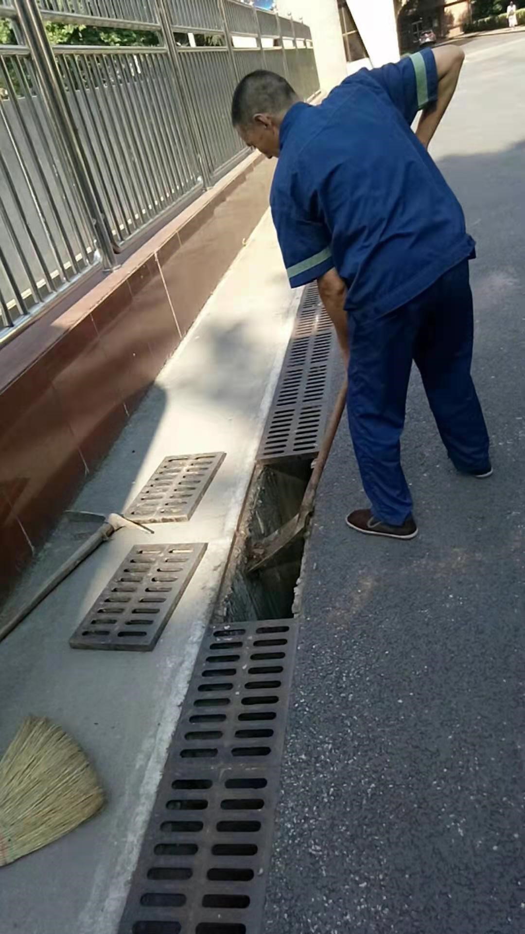 物业工作人员清理校园雨水收水井和排水沟内杂物