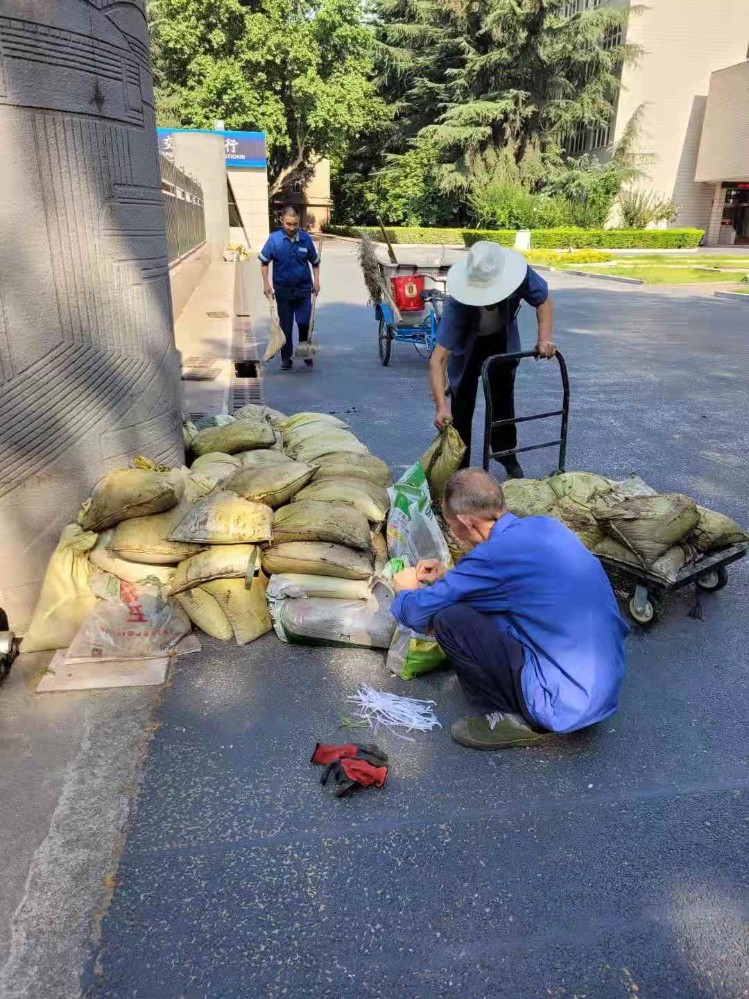 物业人员检查、装填防汛沙袋