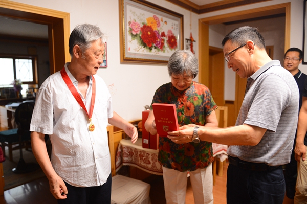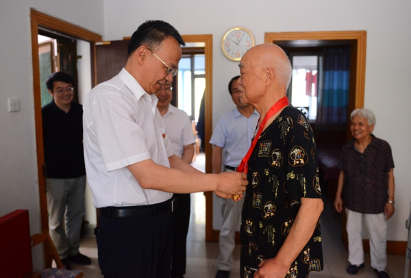 在“庆祝中华人民共和国成立70周年”纪念章获得者、离休干部薛纪元家中,校党委书记赛云秀为薛纪元和姚桂荣夫妇佩戴了“光荣在党50年”纪念章,仔细询问了他们的身体健康状况和生活情况。他指出,在建党100周年之际,党中央决定颁发“光荣在党50年”纪念章,体现了以习近平同志为核心的党中央对老党员的政治关怀,体现了党和人民对老党员历史贡献的充分肯定,希望他们保持愉悦身心、安享晚年生活,并积极为学校提出宝贵意见建议,助力学校改革发展。随后,赛书记慰问了“庆祝中华人民共和国成立70周年”纪念章和“中国人民志愿军抗美援朝出国作战70周年”纪念章获得者董玉田、李秋华夫妇和困难老党员陈宝江,并为他们佩戴了“光荣在党50年”纪念章。在陈宝江同志家中,赛书记亲切询问其身体状况、家庭收入、医药费报销情况以及生活中存在的困难和问题,叮嘱相关部门要多关心老党员的生活,帮助他们解决实际问题。